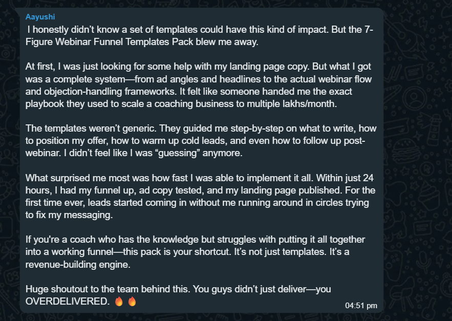 ✅Email & WhatsApp Message Templates: Pre-structured messaging blueprints to engage, remind, and convert your leads — before and after your webinar. Edit to match your voice, and you’re ready to go.